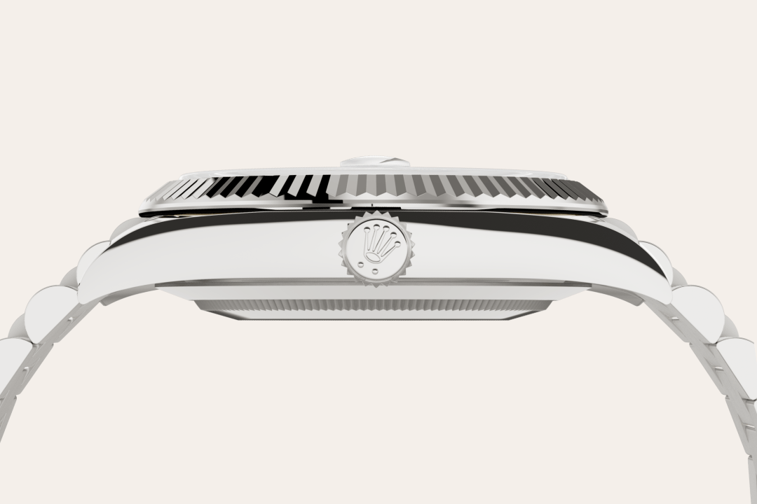 Rolex’in yivli çerçevesi diğerlerinden farklıdır. Başlangıçta Oyster çerçeve yivinin işlevsel bir amacı vardı: Saatin su geçirmez olması için çerçevenin kasaya vidalanmasını sağlamak. Dolayısıyla bu yiv, özel Rolex aletleri kullanılarak aynı amaçla kasaya vidalanan, kasa kapağındaki yivle aynıydı. Yiv zamanla estetik bir unsura dönüştü ve Rolex’in özgün imzası hâline geldi. Bu Day-Date 40 saatinde altından yapılan yivli çerçeve bugün bir seçkinlik işaretidir.
