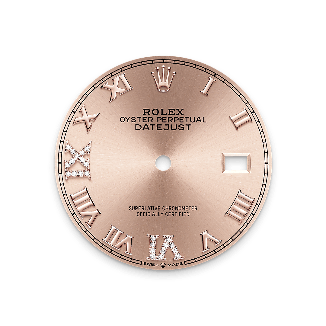 Bu kadranda 18 kt altından, 24 adet pırlantalı VI ve IX Roma rakamları yer alır. Parlayan güneş deseni, Oyster Perpetual koleksiyonundaki birçok kadranda zarif ışık yansımaları yaratır. Kadranın merkezinden dışarı doğru yayılan oluklar oluşturan, ustalıklı fırçalama teknikleriyle elde edilir. Işık, her bir oyuk boyunca kesintiye uğramadan yayılır ve bileğin konumuna göre hareket eden, karakteristik ve hoş bir parıltı ortaya çıkarır. Parlayan güneş deseni tamamlandıktan sonra Fiziksel Buhar Biriktirme (Physical Vapor Deposition) ya da elektrokaplama yöntemiyle kadran rengi uygulanır. İnce bir kat vernik, kadrana son görünümünü kazandırır.
