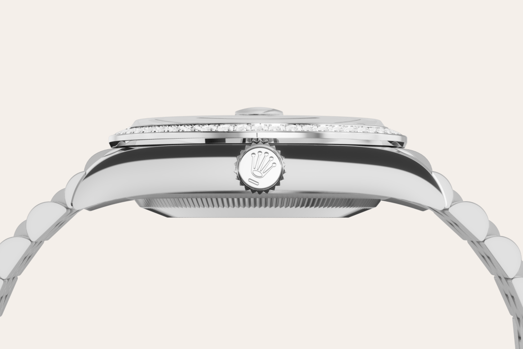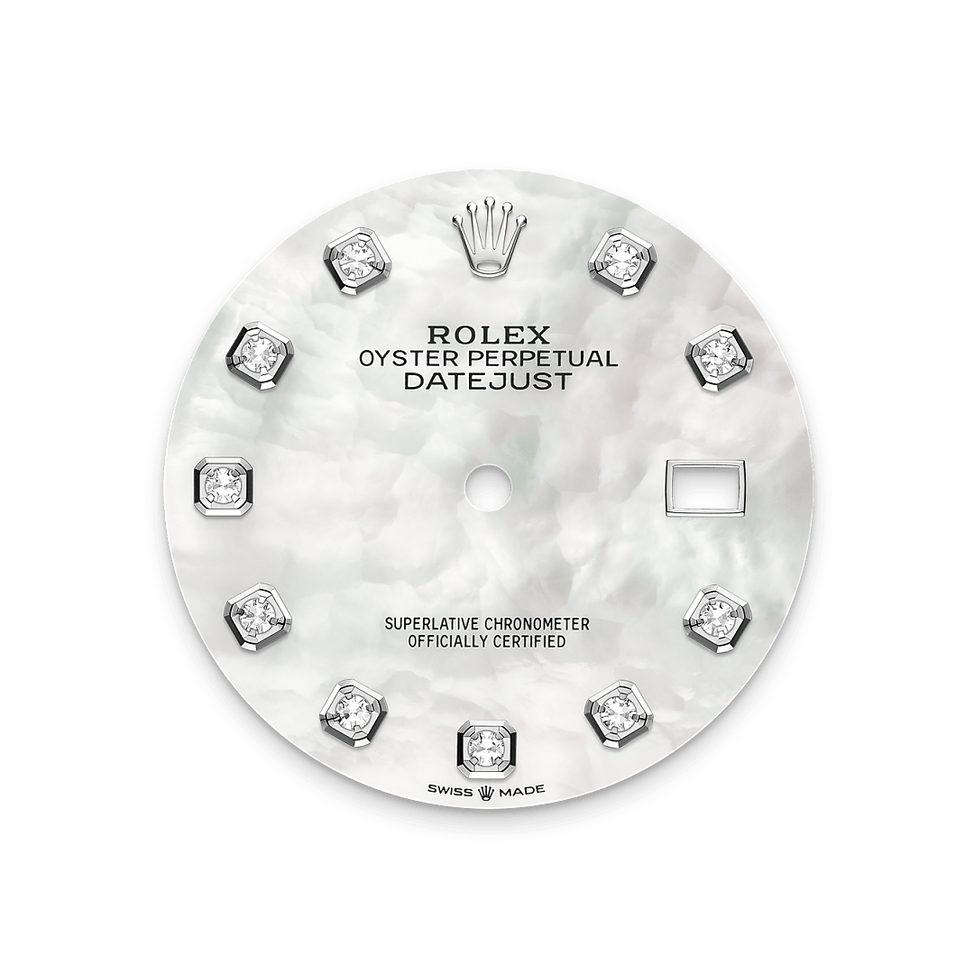 Bu kadranda 18 kt altın yuvalı pırlantalar yer alır. Sedef, doğası gereği gizemlidir ve sürprizlerle doludur. Kaynağına bağlı olarak pembe, beyaz, siyah veya sarı olabilmektedir. Rengi, yoğunluğu ve yapısı, kabuğun hangi kısmından çıkarıldığına bağlı olarak değişiklik gösterir. Rolex’te sedef asla yapay olarak renklendirilmez. Bunun yerine özel bir bilgi birikimi ve beceri, sedefin doğal güzelliğinin vurgulanması ve orijinal tonlarının korunmasına adanır. Tüm sedef kadranlar benzersiz parçalar olduğundan, bir başkasının bileğinde aynı kadrana rastlamak asla mümkün olmayacaktır.