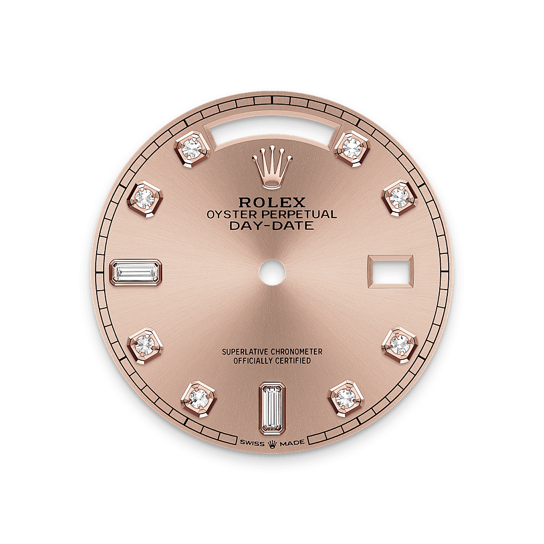 Bu kadranda 18 kt altın yuvalı pırlantalar, saat 6 ve 9 konumunda baget kesim pırlantalar yer alır. Parlayan güneş deseni, Oyster Perpetual koleksiyonundaki birçok kadranda zarif ışık yansımaları yaratır. Kadranın merkezinden dışarı doğru yayılan oluklar oluşturan, ustalıklı fırçalama teknikleriyle elde edilir. Işık, her bir oyuk boyunca kesintiye uğramadan yayılır ve bileğin konumuna göre hareket eden, karakteristik ve hoş bir parıltı ortaya çıkarır. Parlayan güneş deseni tamamlandıktan sonra Fiziksel Buhar Biriktirme (Physical Vapor Deposition) ya da elektrokaplama yöntemiyle kadran rengi uygulanır. İnce bir kat vernik, kadrana son görünümünü kazandırır.