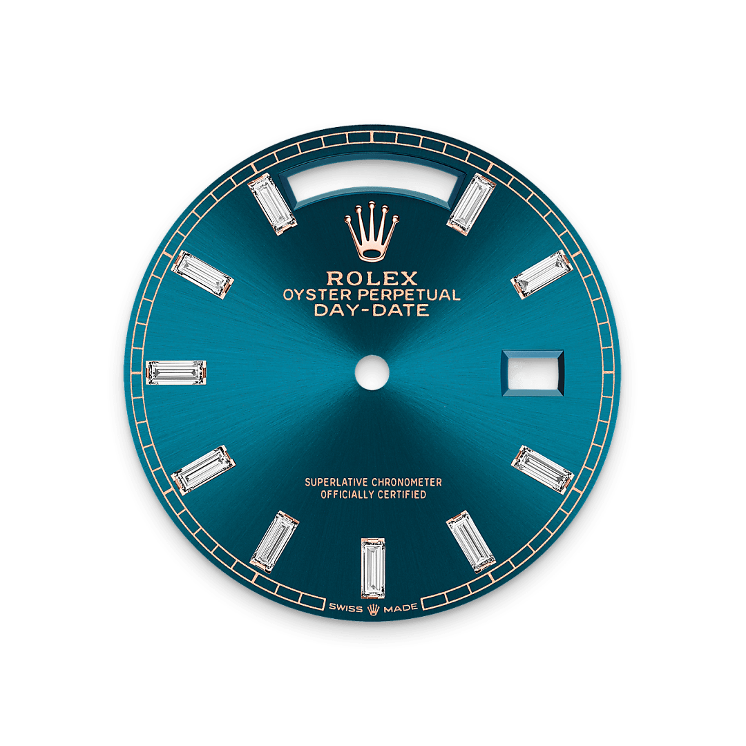 Bu kadranda 10 adet baget kesim pırlanta yer alır. Parlayan güneş deseni, Oyster Perpetual koleksiyonundaki birçok kadranda zarif ışık yansımaları yaratır. Kadranın merkezinden dışarı doğru yayılan oluklar oluşturan, ustalıklı fırçalama teknikleriyle elde edilir. Işık, her bir oyuk boyunca kesintiye uğramadan yayılır ve bileğin konumuna göre hareket eden, karakteristik ve hoş bir parıltı ortaya çıkarır. Parlayan güneş deseni tamamlandıktan sonra Fiziksel Buhar Biriktirme (Physical Vapor Deposition) ya da elektrokaplama yöntemiyle kadran rengi uygulanır. İnce bir kat vernik, kadrana son görünümünü kazandırır.