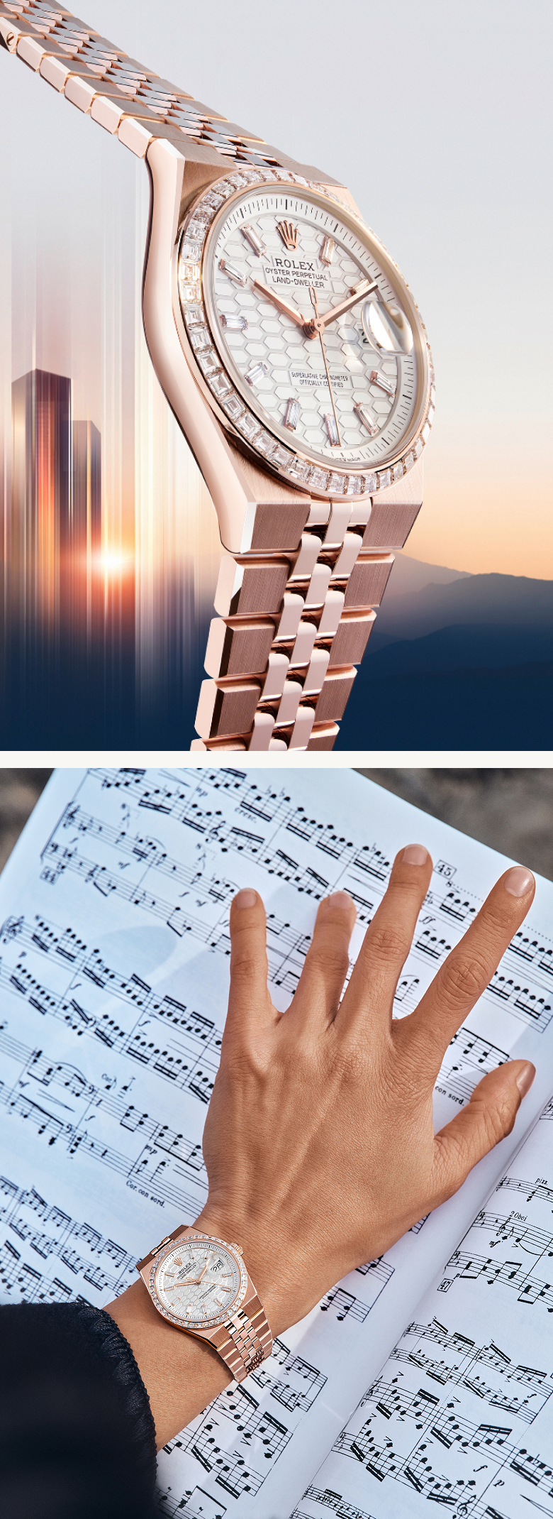 Land-Dweller, kasa ve bilezik arasında akıcı ve kesintisiz bir hat sunan entegre bilezikli saat tasarımına yeni bir soluk getirmektedir. 1945’te Datejust’la sunulan simgeleşmiş Jubilee bilezikten ilham alan Flat Jubilee bilezik, Land-Dweller için özel olarak tasarlanmıştır. Bağlantıları, metal bileziklerimiz için benzersiz bir özellikle kendilerine özgü düz bir yüzeye sahiptir. Aynı zamanda cilalı merkezî bağlantıları ve üst kısmı teknik saten finişli, yanları ise cilalı dış bağlantıları ile farklı finişleri yepyeni bir biçimde bir araya getirir. Yandan bakıldığında, kasa kenarlarının üst kısmındaki cilalı pahlar ve dış bağlantılar bir ışık halkası oluşturur.