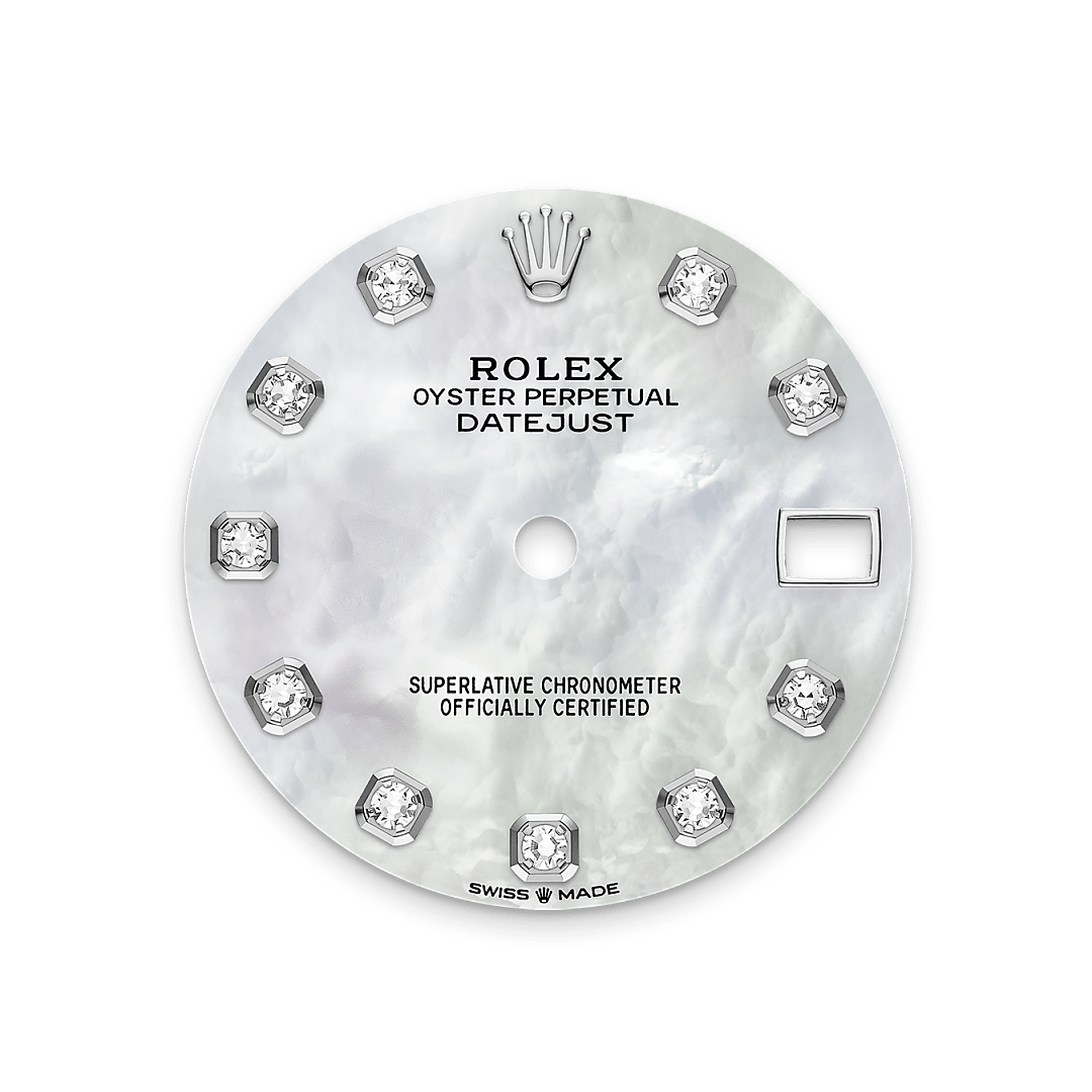 Bu kadranda 18 kt altın yuvalı pırlantalar yer alır. Sedef, doğası gereği gizemlidir ve sürprizlerle doludur. Kaynağına bağlı olarak pembe, beyaz, siyah veya sarı olabilmektedir. Rengi, yoğunluğu ve yapısı, kabuğun hangi kısmından çıkarıldığına bağlı olarak değişiklik gösterir. Rolex’te sedef asla yapay olarak renklendirilmez. Bunun yerine özel bir bilgi birikimi ve beceri, sedefin doğal güzelliğinin vurgulanması ve orijinal tonlarının korunmasına adanır. Tüm sedef kadranlar benzersiz parçalar olduğundan, bir başkasının bileğinde aynı kadrana rastlamak asla mümkün olmayacaktır.